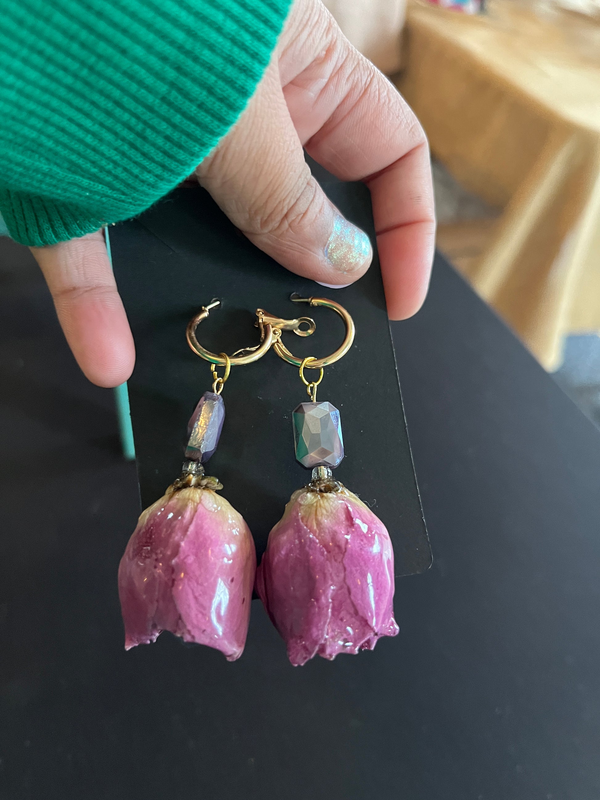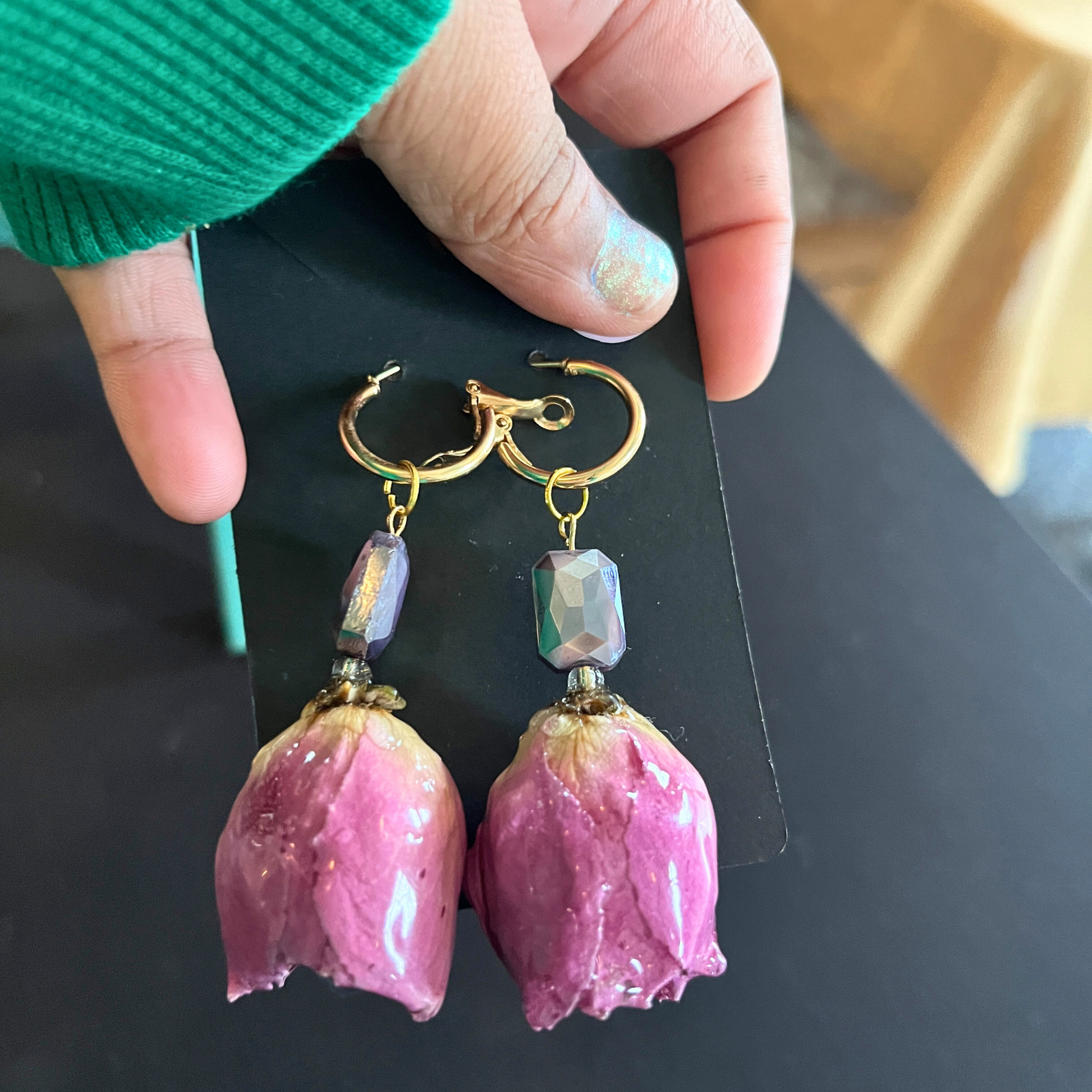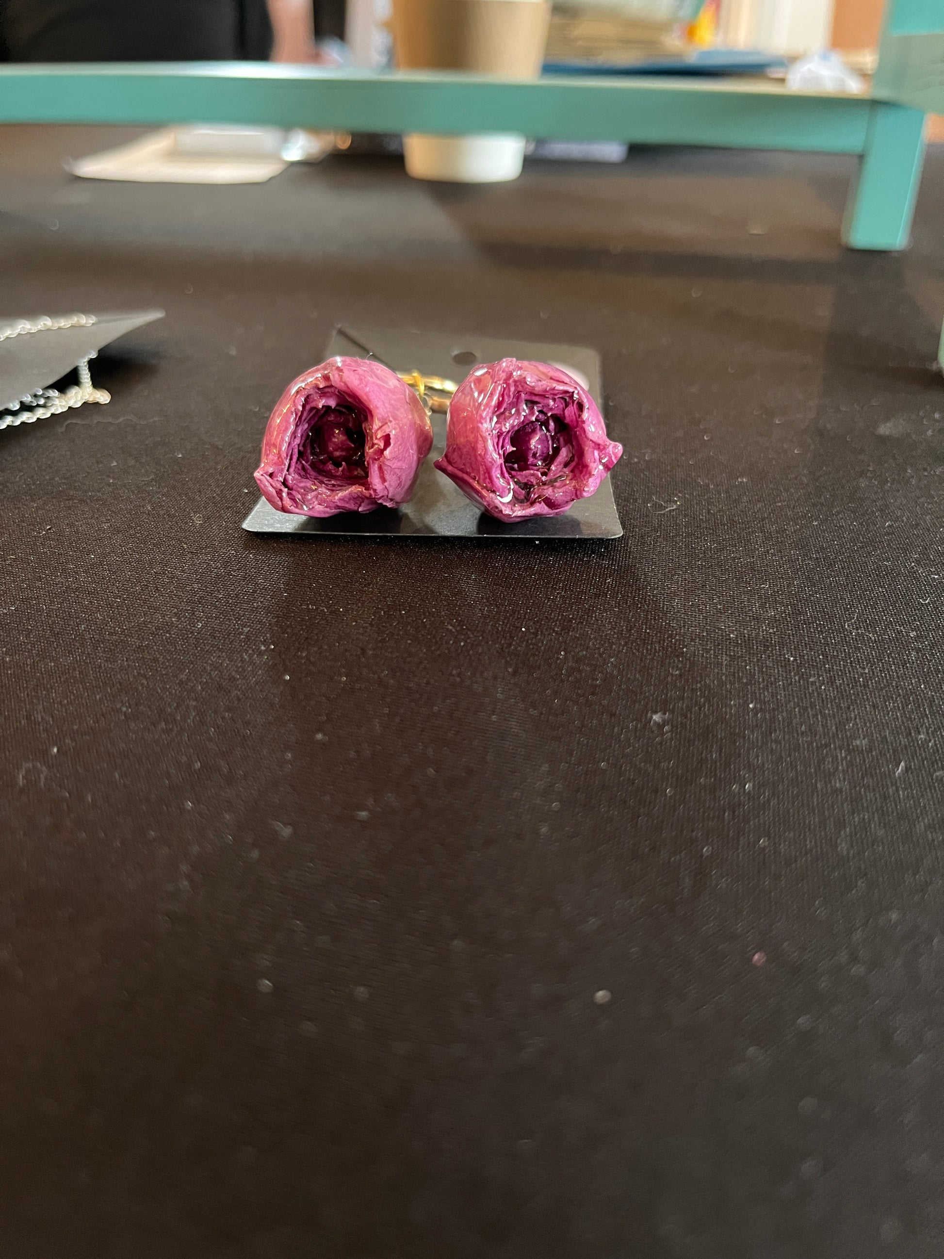 Real Pink rose earring preserved in resin with nickel and lead free hoops.