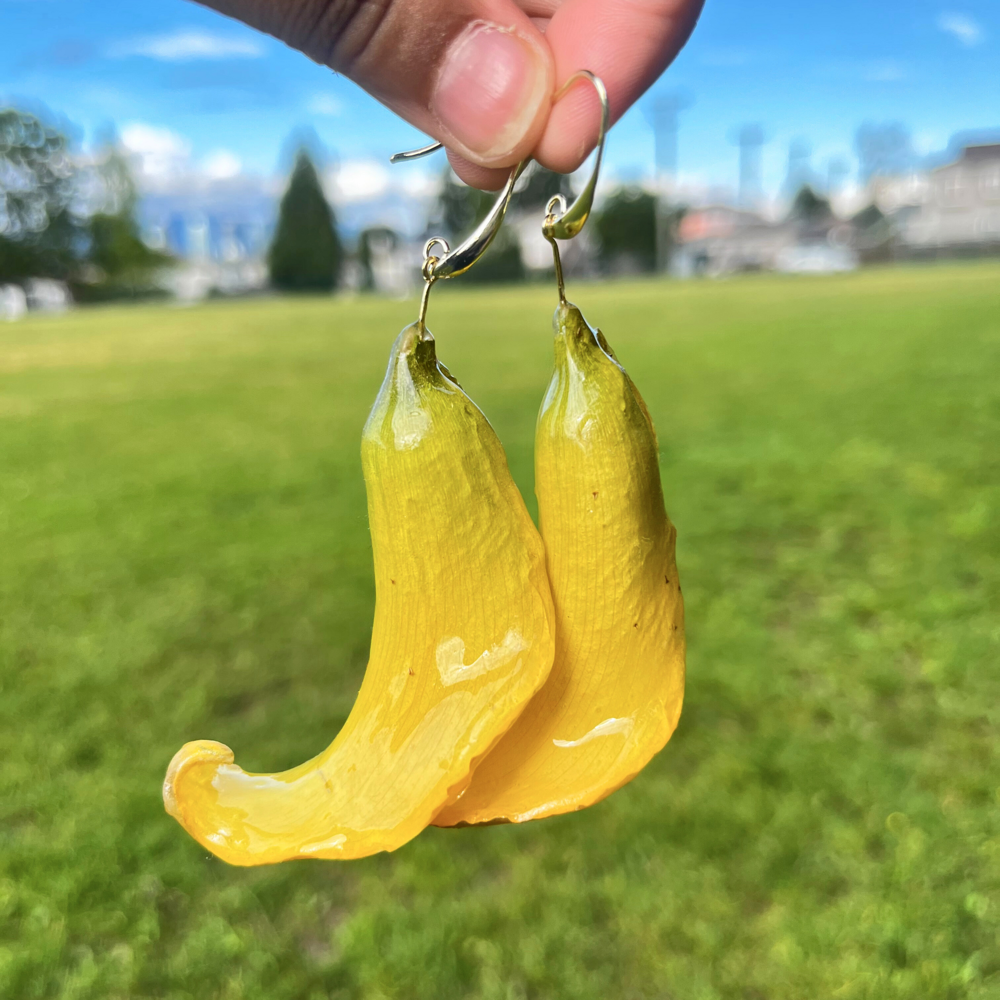 Large Real Yellow Calla Lily Flower Earring preserved in resin and made with gold filled hooks.