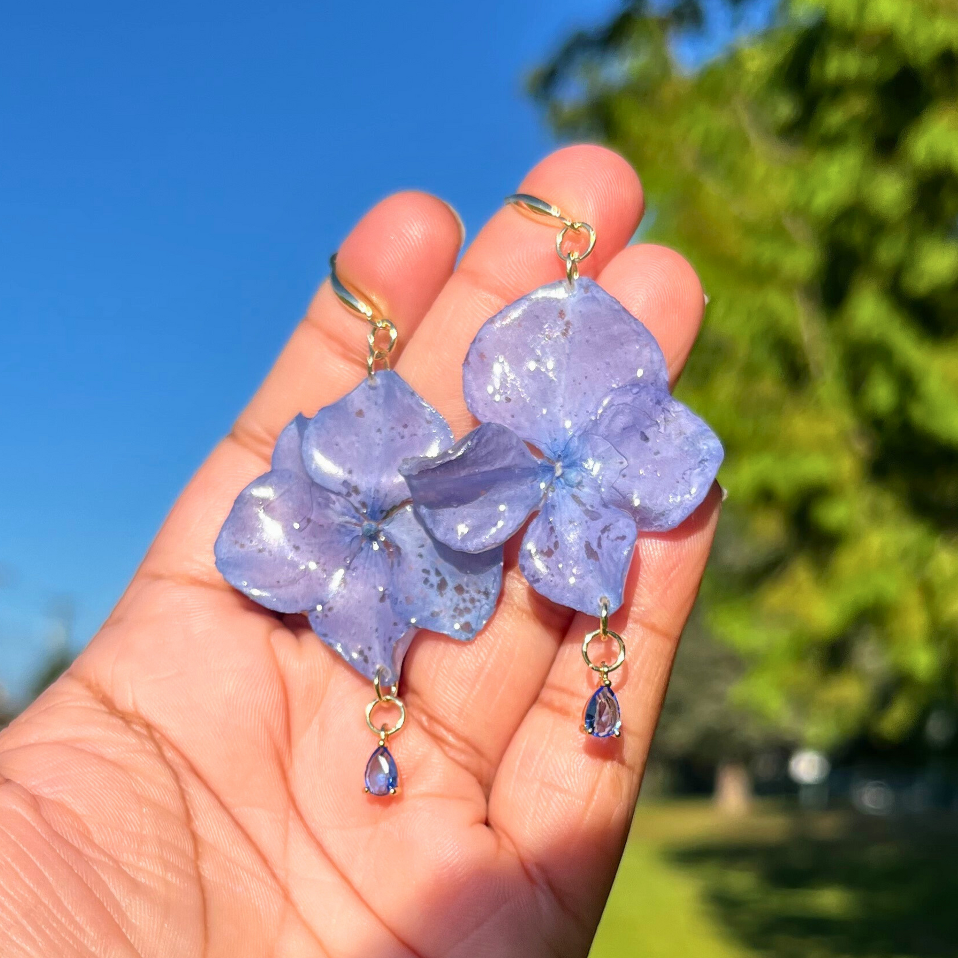 Real Hydrangea Earrings with a small blue charm preserved in resin and made with gold filled hooks.