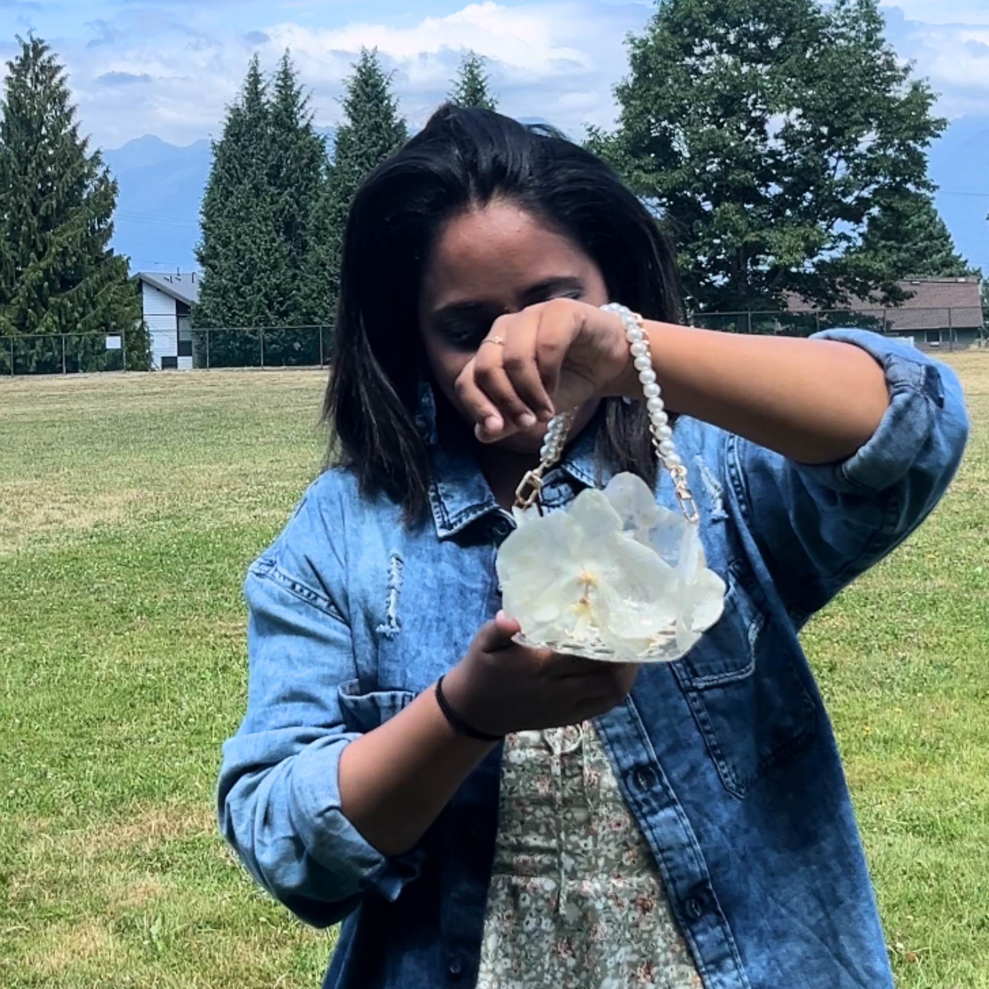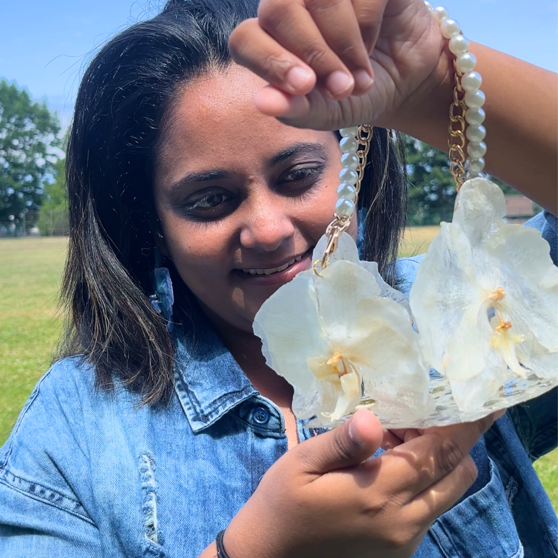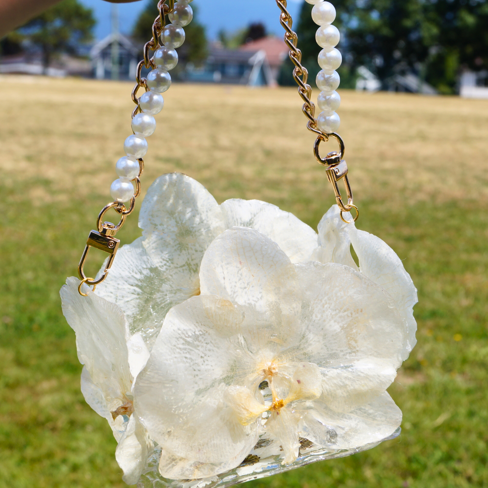 This orchid handbag is made with REAL flowers. Took me hours — and a little bit of magic — to make. She’s a one-of-a-kind beauty, just like you. She's the kind you see, fall in love with, and grab before someone else does