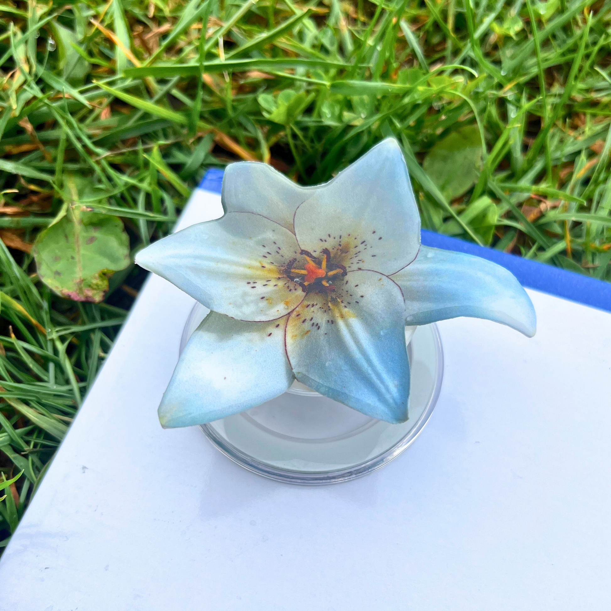Elevate your everyday phone grip with this handcrafted pop socket featuring white lily flower (not real flower)